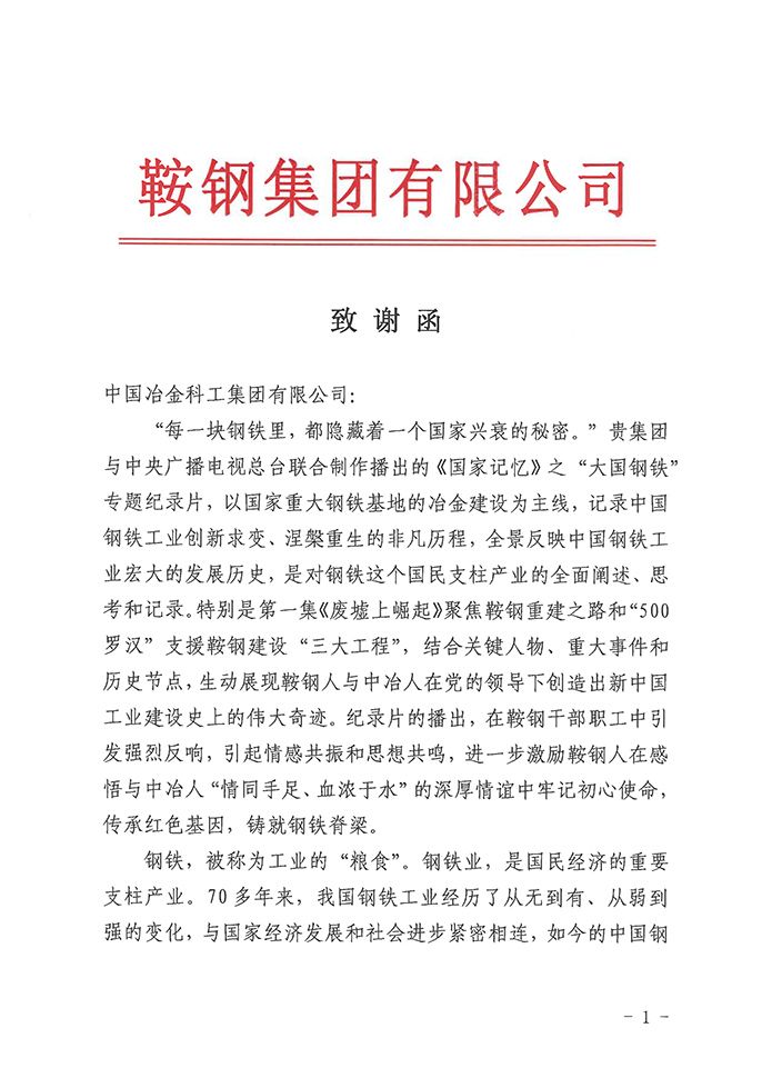鞍钢在感谢信中指出,中冶集团与央视总台联合制作播出的《国家记忆》之“大国钢铁”专题纪录片,以国家重大钢铁基地的冶金建设为主线,记录中国钢铁工业创新求变、涅槃重生的非凡历程,全景反映中国钢铁工业宏大的发展历史。特别是第一集《废墟上崛起》聚焦鞍钢重建之路和“500罗汉”支援鞍钢建设“三大工程”,结合关键人物、重大事件和历史节点,生动展现鞍钢人与中冶人在党的领导下创造出新中国工业建设史上的伟大奇迹。纪录片的播出,在鞍钢干部职工中引发强烈反响,引起情感共振和思想共鸣。回首过往,鞍钢与中冶集团在峥嵘岁月中结下深厚情谊,衷心祝愿中冶集团“冶金建设国家队”风采永驻;放眼未来,让我们继续携手并肩前行,描绘出钢铁行业更加壮丽的篇章,以实际行动迎接党的二十大胜利召开。