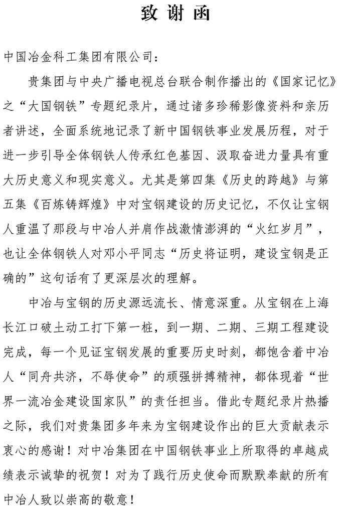 武钢在感谢信中指出,中冶集团与中央广播电视总台联合制作播出的《国家记忆》之“大国钢铁”专题纪录片,以历史时序为经、以现实发展为纬,通过珍贵的影像资料、历史文献、人物访谈,全面呈现中国钢铁工业极不平凡的历史发展进程,全景展示了中国冶金建设事业奋斗史、发展史、跨越史,政治性、思想性、艺术性俱佳。特别是在《风云中成长》《历史的跨越》分集故事中,在武钢广大职工中引发强烈反响和好评,感人肺腑、令人动容、催人奋进。愿与“冶金建设国家队”——中冶集团携手共进、团结奋斗、相伴成长,共同为中国钢铁事业的美好明天而努力奋斗。