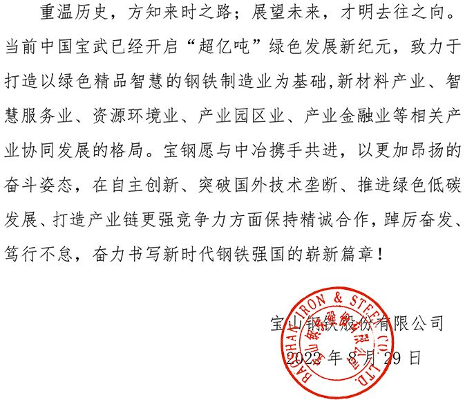 宝钢在感谢信中指出,中冶集团与中央广播电视总台联合制作播出的《国家记忆》之“大国钢铁”专题纪录片,通过诸多珍稀影像资料和亲历者讲述,全面系统地记录了新中国钢铁事业发展历程,对于进一步引导全体钢铁人传承红色基因、汲取奋进力量具有重大历史意义和现实意义。尤其是第四集《历史的跨越》与第五集《百炼铸辉煌》中对宝钢建设的历史记忆,不仅让宝钢人重温了那段与中冶人并肩作战激情澎湃的“火红岁月”,也让全体钢铁人对邓小平同志“历史将证明,建设宝钢是正确的”这句话有了更深层次的理解。借此专题纪录片热播之机,我们对中冶集团多年来为宝钢建设作出的巨大贡献表示衷心的感谢!对中冶集团在中国钢铁事业上所取得的卓越成绩表示诚挚的祝贺!对为了践行历史使命而默默奉献的所有中冶人致以崇高的敬意!宝钢愿与中冶携手共进,以更加昂扬的奋斗姿态,在自主创新、突破国外技术垄断、推进绿色低碳发展、打造产业链更强竞争力方面保持精诚合作,踔厉奋发、笃行不怠,奋力书写新时代钢铁报国、钢铁强国的崭新篇章!