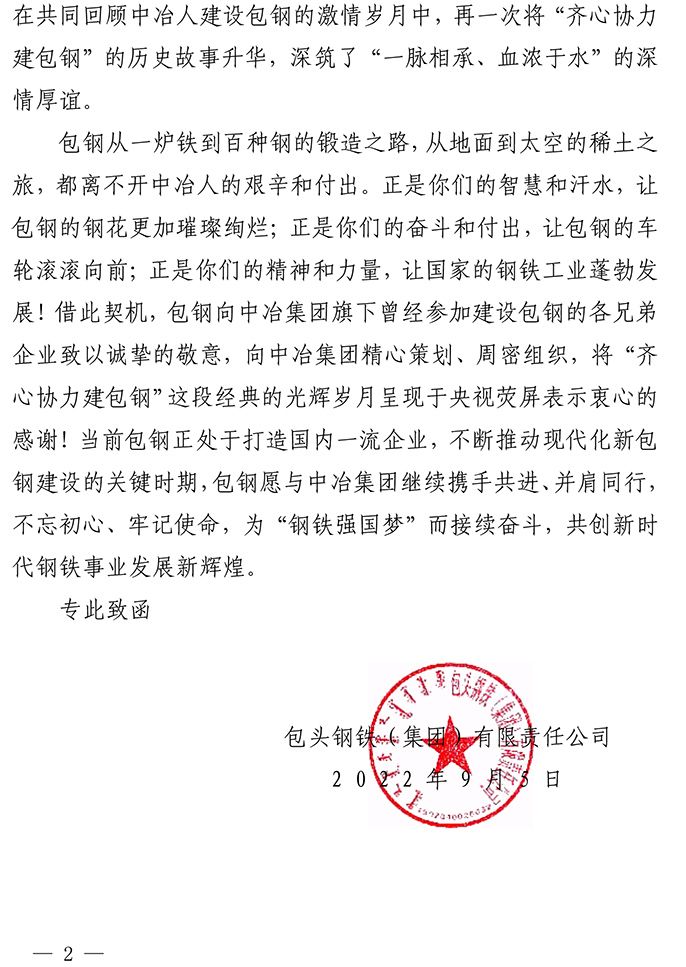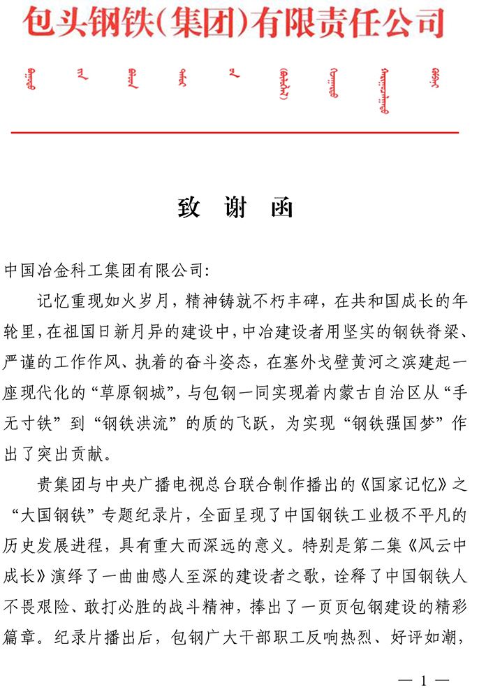 包钢在感谢信中指出,中冶集团与央视总台联合制作播出的《国家记忆》之“大国钢铁”专题纪录片,全面呈现了中国钢铁工业极不平凡的历史发展进程,具有重大而深远的意义。特别是第二集《风云中成长》诠释了中国钢铁人不畏艰险、敢打必胜的战斗精神,捧出了一页页包钢建设的精彩篇章,演绎了一曲曲感人至深的建设者之歌。纪录片播出后,包钢(集团)公司干部职工反响热烈,好评如潮。借此契机,包钢(集团)公司向中冶集团旗下曾经参加建设包钢的各兄弟企业致以诚挚的敬意,向中冶集团精心策划、周密组织,将“齐心协力建包钢”这段经典的光辉岁月呈现于央视荧屏表示衷心的感谢!包钢(集团)公司愿与中冶集团继续携手共进、并肩同行,不忘初心、牢记使命,为“钢铁强国梦”而接续奋斗,共同推进新时代钢铁事业发展再创新辉煌!
