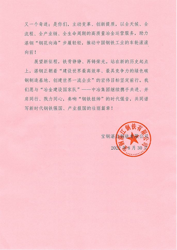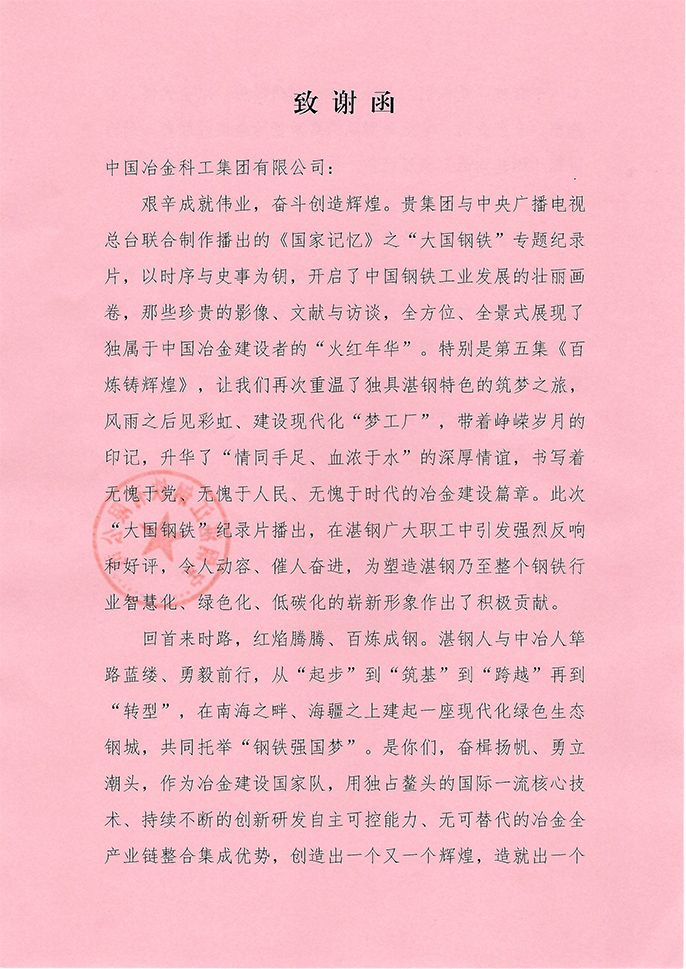 湛钢在感谢信中指出,中冶集团与央视总台联合制作播出的《国家记忆》之“大国钢铁”专题纪录片,以时序与史事为钥,开启了中国钢铁工业发展的壮丽画卷,那些珍贵的影像、文献与访谈,全方位、全景式展现了独属于中国冶金建设者的“火红年华”。特别是第五集《百炼铸辉煌》,让我们再次重温了独具湛钢特色的筑梦之旅,升华了“情同手足、血浓于水”的深厚情谊。此次“大国钢铁”纪录片播出,在湛钢广大职工中引发强烈反响和好评,为塑造湛钢乃至整个钢铁行业智慧化、绿色化、低碳化的崭新形象作出了积极贡献。我们愿与“冶金建设国家队”——中冶集团继续携手共进、并肩同行、戮力同心,奏响“钢铁挂帅”的时代强音,共同谱写新时代钢铁强国、产业报国的壮丽篇章!