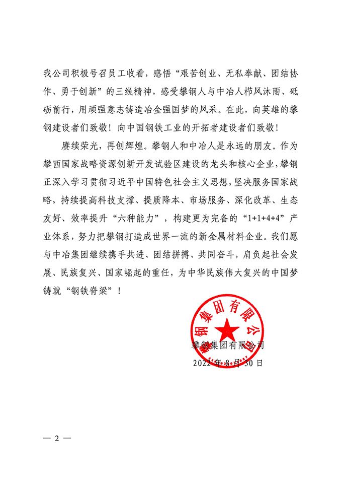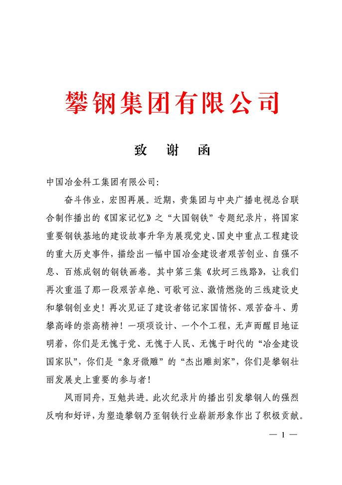 攀钢在感谢信中指出,中冶集团与央视总台联合制作播出的《国家记忆》之“大国钢铁”专题纪录片,将国家重大钢铁基地的建设故事升华为能够展现党史、国史中重大工程建设的重大历史事件,描绘出一幅中国冶金建设者艰苦创业、自强不息、百炼成钢的钢铁画卷。其中第三集《坎坷三线路》,让我们再次重温了那一段段可歌可泣、感人肺腑、激情燃烧、威武雄壮的三线建设史、攀钢创业史。此次“大国钢铁”纪录片播出引发攀钢集团的强烈反响和好评,为塑造攀钢乃至钢铁行业崭新形象作出了积极贡献。在此,向英雄的攀钢建设者们致敬!向中国钢铁工业的开拓者建设者们致敬!我们愿与中冶集团继续携手共进、团结拼搏、共同奋斗,肩负起社会发展、民族复兴、国家崛起的重任,为中华民族伟大复兴的中国梦贡献中国钢铁人的智慧和力量!